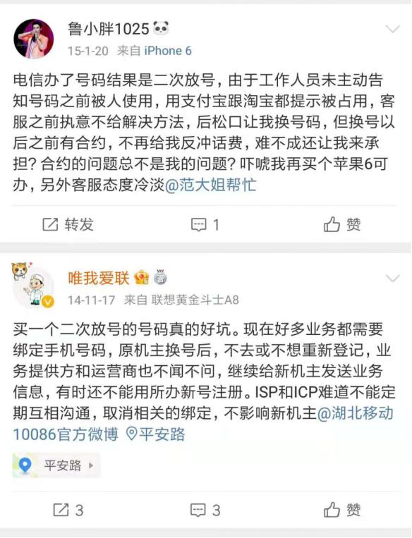类似的问题包括且不限于“遇到二次放号,我的社交软件账号怎么办”“手机号不用了,以后微信会被人顶掉吗?”“我以前微博注册的手机号已经停用了,最近又有人用了,需不需要声明不是我?”“百度,京东都是上个号主的账号,如何更改?”